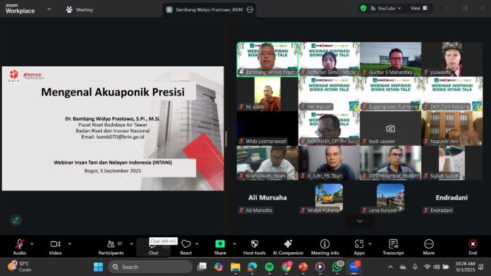 Webinar Intani Talk edisi ke-174 (03/09/2025) kembali digelar dengan topik menarik: “Mengenal Aquaponik Presisi”. Program kolaborasi antara INTANI dan Divisi ESG PT Pegadaian ini menghadirkan Dr. Bambang Widoo Prastowo, S.Si., M.Si., peneliti dari Pusat Riset Budidaya Air Tawar BRIN, yang sudah berpengalaman panjang dalam riset akuakultur dan sistem aquaponik.