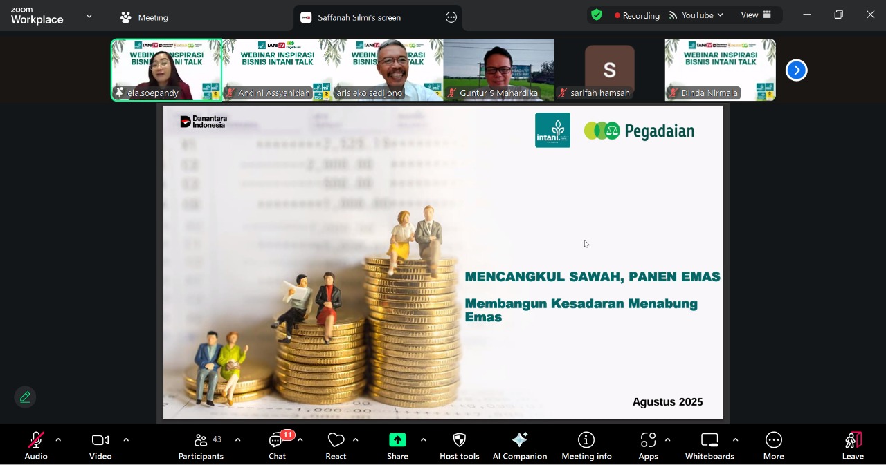 Jakarta, 27 Agustus 2025 – Webinar INTANI Talk edisi ke-173 menghadirkan diskusi inspiratif bertema “Mencangkul Sawah Panen Emas: Membangun Kesadaran Menabung Emas”. Kegiatan yang digelar Rabu (27/8) ini merupakan kolaborasi antara Insan Tani dan Nelayan Indonesia (INTANI) dengan Divisi Environmental Social and Governance (ESG) PT Pegadaian.